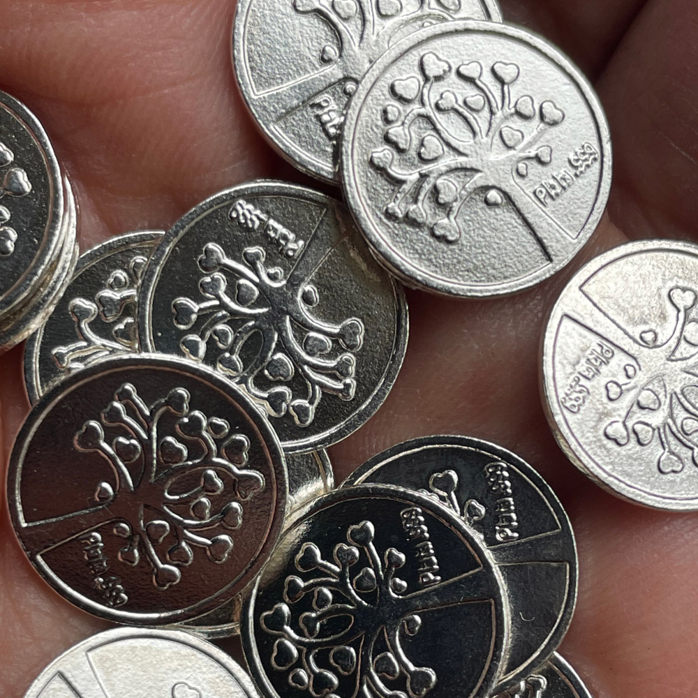 Estas arras son personalizadas en plata y llevan granado el árbol del amor, cuyas ramas se abren en pequeños corazones, por la otra cara de la moneda se personalizan con las iniciales de los novios.